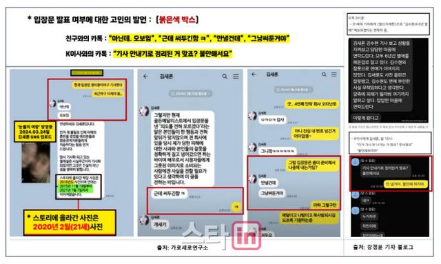고 변호사는 김새론이 지인 및 관계자와 나눈 대화 내용을 근거로 들며 “고인은 당시 누군가의 도움을 받아 준비한 것으로 보이는 위 허위 입장문 초안을 외부에 발표할 생각이 애초에 없었던 것으로 보인다”고 추측했다. 이어 그는 “만일 허위 입장문이 당시에 그대로 발표되었다면, 해당 사진이 2016년에 촬영한 것이라는 주장이 거짓임이 그 즉시 드러났을 것이다. 이를 모를 리가 없는 고인이 허위 입장문 발표를 강행할 이유는 없었을 것”이라면서 “그럼에도 불구하고 당시 발표하지도 못할 이 허위 입장문은 어떠한 모종의 이유로 준비되었고, 그것은 1년 뒤 이번 사건의 단초가 됐다”고 썼다.