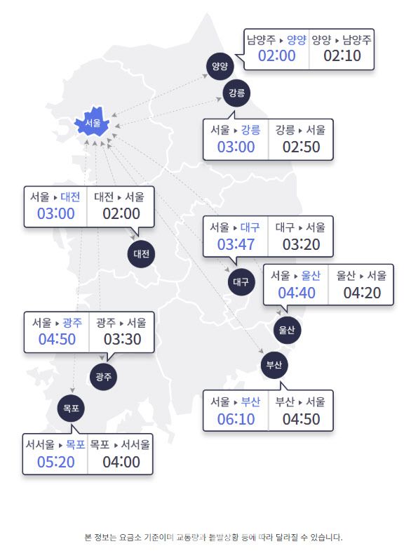지방에서 서울까지는 △부산 4시간 50분 △울산 4시간 20분 △강릉 2시간 50분 △양양 2시간 10분(남양주 도착) △대전 2시간 △광주 3시간 30분 △목포 4시간(서서울 도착) △대구 3시간 20분이 걸릴 것으로 예상된다.