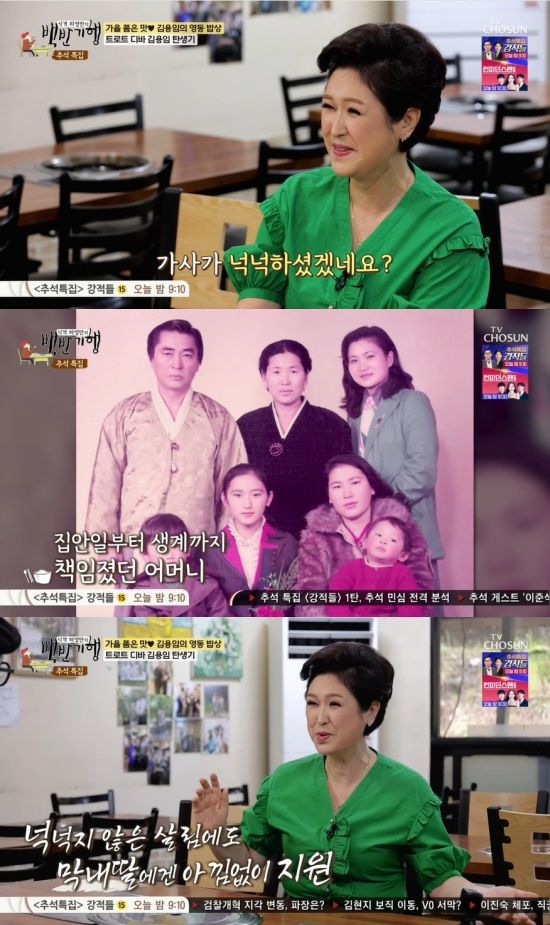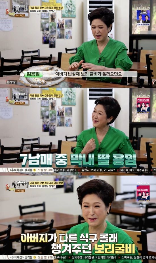 이를 들은 허영만은 "보리굴비도 올라올 정도면 가사가 넉넉하셨겠다"고 말했는데, 김용임은 "그건 아니다. 돈 버는 것도 엄마가 하시고, 집안 일도 다 챙기고 아이들 챙기는 것도 엄마가 하셔서 고생이 많으셨다"고 털어놨다.