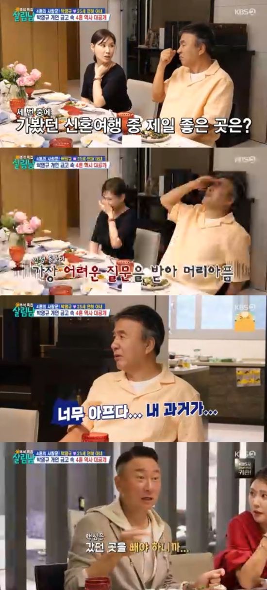 차마 말을 잇지 못하던 박영규는 손으로 3을 표시하며 세 번째로 갔던 신혼여행지가 가장 좋았다고 대답한 뒤 "내 과거가 너무 아프다"고 착잡해 했다.