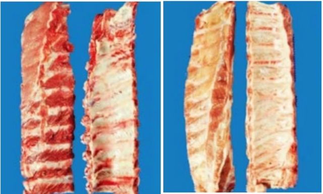 돼지고기 등갈비. 국산(왼쪽), 스페인산(오른쪽) / 국립농산물품질관리원 제공