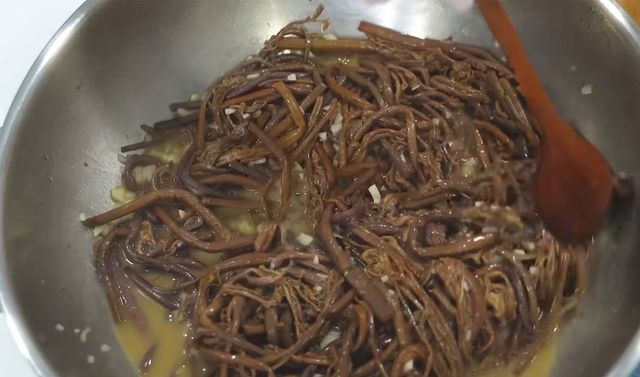 본격 조리 단계에서는 불린 고사리에 다진 마늘 5쪽을 넣는다. 이후 핵심은 국간장을 넣는 것이다. 유튜버는 "집에서 담은 국간장을 넣어줘야 비린 맛이 없고 아주 맛있다"고 했다. 여기에 콩기름, 들기름 2큰술, 참기름 1큰술을 차례로 넣는다.