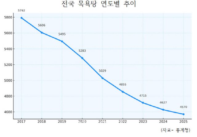 5일 국세청에 따르면 지난 7월 말 기준 전국 목욕탕의 숫자는 4543곳으로 집계됐다. 여기서 목욕탕의 기준은 대중목욕탕·찜질방·사우나 등 물로 목욕 할 수 있거나 맥반석·황토 등 땀을 낼 수 있는 시설을 갖춘 업소를 말한다.