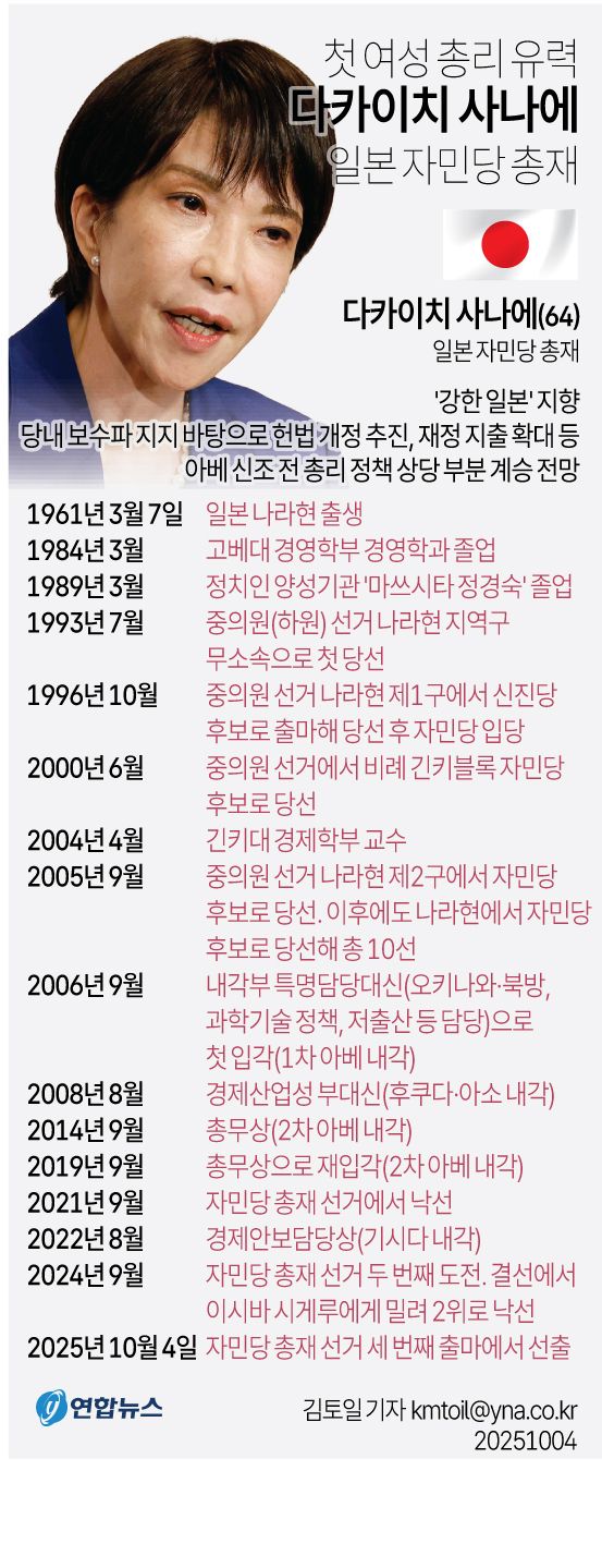 다카이치 총재는 혼슈 서부 나라현 출신으로 1993년 중의원(하원) 선거에서 나라현 지역구에 출마해 처음 당선됐고 지금은 10선 의원이다.