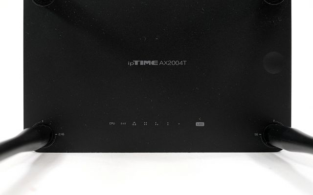 상단에는 제품 상태를 한눈에 확인할 수 있는 LED 인디케이터 라인이 자리한다. 중앙에는 AX2004T 로고가 정갈하게 인쇄되어 있으며, 아래로 CPU, 2.4GHz, 5GHz, 인터넷 연결, LAN 포트, 전원 등 주요 상태를 표시하는 LED가 일렬로 배열돼 있다. 상태 LED는 밝기가 약하기에 어두운 환경에서 식별이 용이하다.