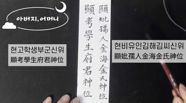 고인의 직위와 이름을 적는 방식도 정해져 있다. 남성 조상은 이름 대신 ‘부군(府君)’이라고 쓰고, 여성 조상은 본관과 성씨를 함께 기록한다. 벼슬을 하지 않은 남자는 ‘학생(學生)’, 부인은 ‘유인(孺人)’이라 쓰며, 벼슬을 지낸 경우에는 관직명을 적는다. 여성 조상은 남편의 관직에 따라 ‘정경부인’ ‘정부인’ 등 나라에서 내린 호칭을 기재한다. 마지막에는 반드시 ‘신위(神位)’라고 적어 조상을 모시는 자리임을 명확히 한다.