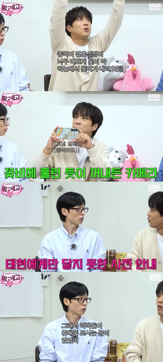 차태현은 "사실 내가 결혼식(에 갔을 때) 사진을 잘 안 찍는다. 그런데 종국이 결혼식장에서는 너무 예쁘게 하늘에 꽃이 꽃비가 내려오듯이 쏟아지더라. 그런데 난 '결혼식 사진을 찍지 마라'는 말을 못 들었다"고 얘기했다.