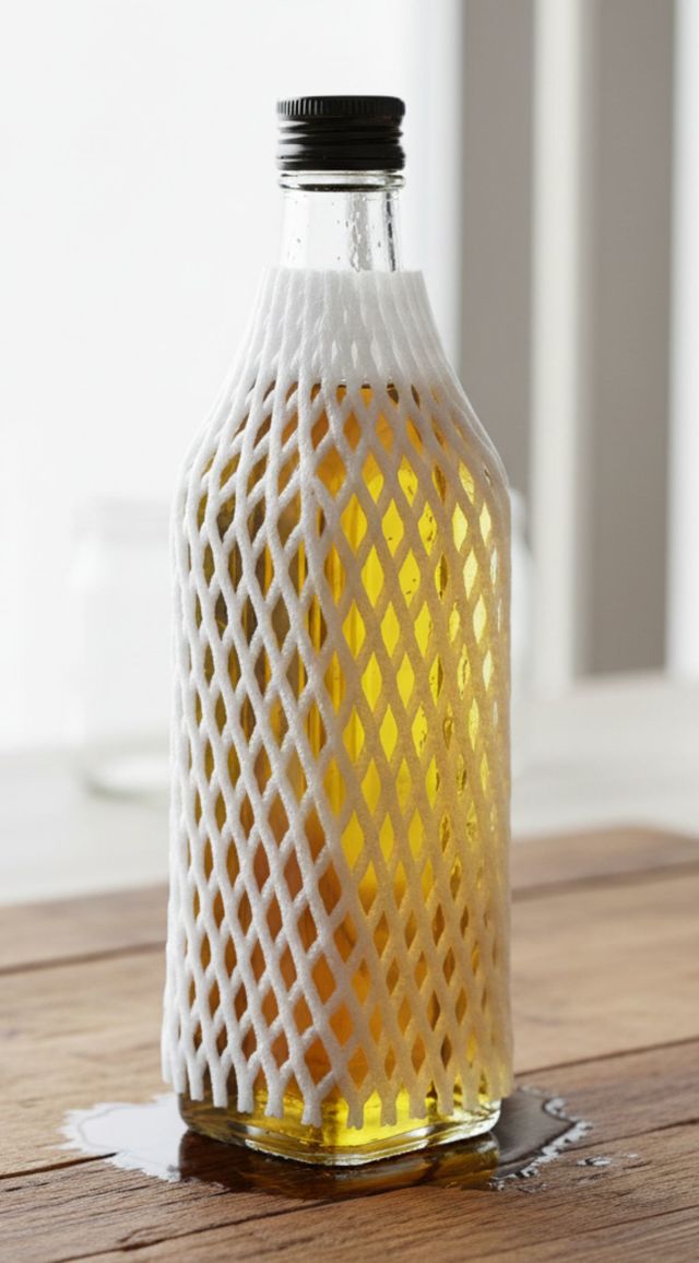 주방에서 자주 흘리는 참기름이나 식용유 병에도 과일망을 끼워보자. 병의 손잡이 부분이나 밑부분을 감싸면 기름이 흘러내려도 미끄러지지 않고 손에 묻지 않는다. 기름병이 식탁이나 찬장 위에서 미끄러지는 것도 방지할 수 있다.