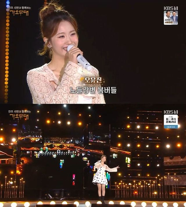오유진은 지난 6일 방송된 KBS1 ‘가요무대’에 출연해 무대를 꾸몄다. 진주시민과 함께하는 가요무대 특집으로 진행된 가운데 오유진은 박부용의 ‘노들강변’을 선곡, 특유의 청아하면서도 힘 있는 보이스와 가창력을 보여주며 이목을 사로잡았다.