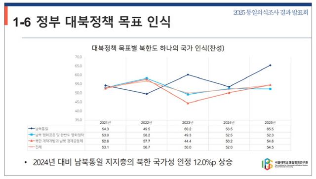 북한의 국가성을 인정하는 응답 비율은 최근 몇 년간 상승세를 보였다. 2023년 49.9%, 2024년 52.1%였고, 올해는 54.5%로 높아졌다.