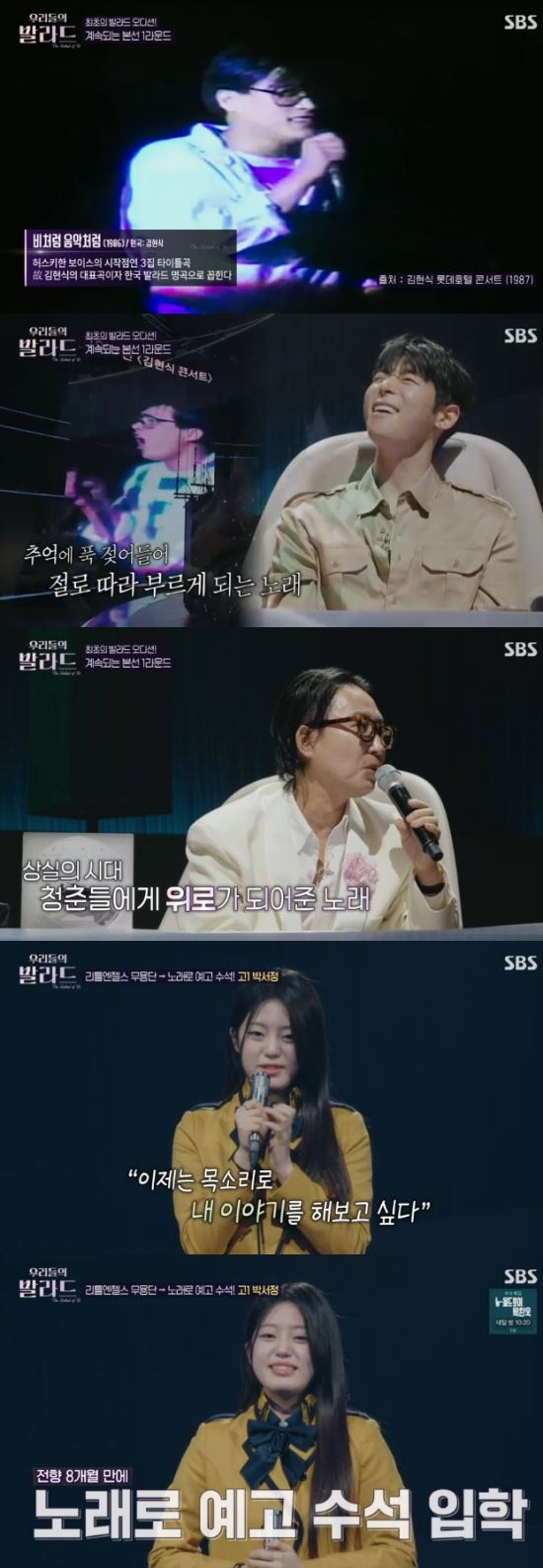 7일 방송된 SBS 예능 프로그램 '우리들의 발라드' 3회에서는 '탑백귀' 대표 전현무, 정재형, 추성훈, 차태현, 박경림, 대니 구, 크러쉬, 미미, 정승환이 출연해 참가자들의 무대를 보며 이야기를 나눴다.