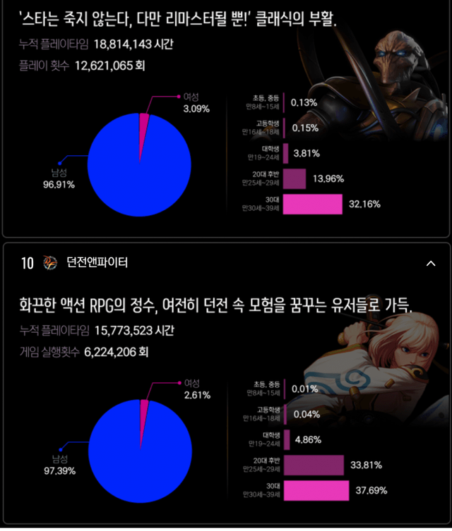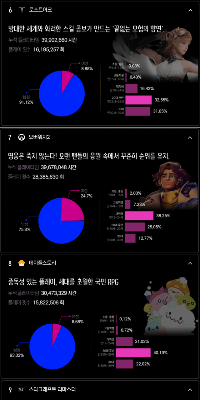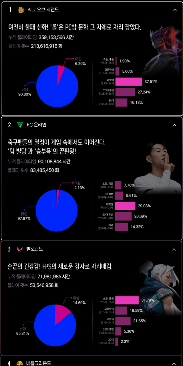 게임별로 보면 발로랑 로블록스는 확실히 연령층이 어리단 게 보이네