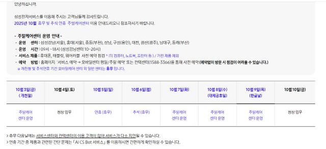 오늘(8일)과 내일(9일), 주말케어센터를 운영하며, 10일에는 정상 업무를 한다. 다만 연휴 직후에는 고객이 몰려 서비스 지연이 예상된다.
