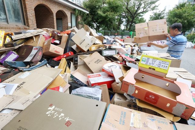 지난해명절 연휴가 지나고 한 아파트단지 분리수거장에 명절 기간 동안 배출된 재활용 쓰레기가 수북이 쌓여 있다. / 뉴스1