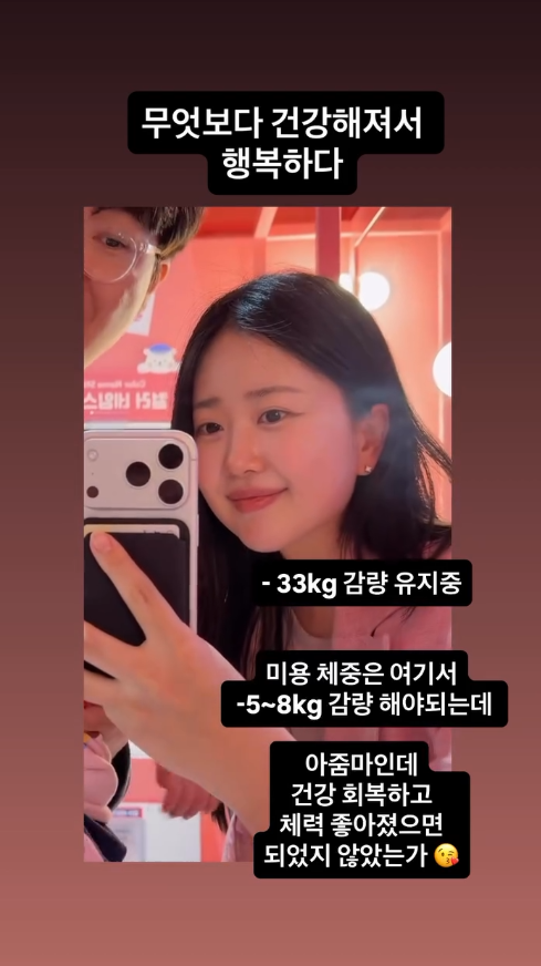 이어 “33kg 감량 유지 중”이라며 “미용 체중은 여기서 5~8kg 감량해야 되는데, 아줌마인데 건강 회복하고 체력 좋아졌으면 됐지 않는가”라고 덧붙였다.