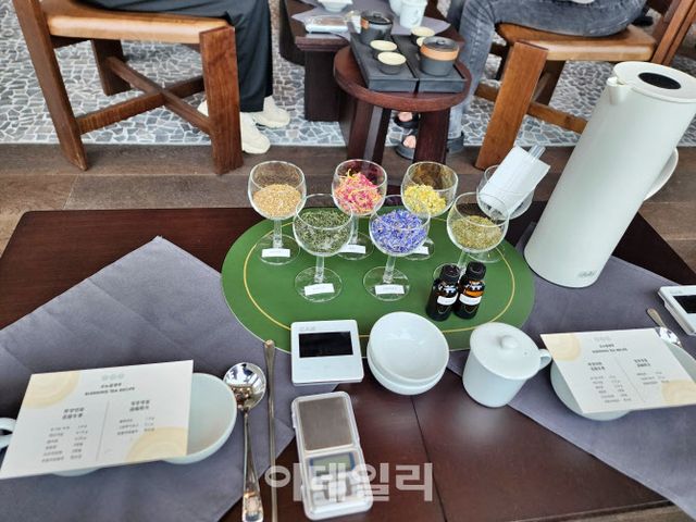 테이블 위에는 여섯 잔의 유리잔이 놓였다. 각각의 잔에는 다른 색의 허브잎이 담겨 있었다. 노란 캐모마일, 보랏빛 콘플라워, 분홍 장미잎, 녹차잎, 그리고 은은한 향의 페퍼민트까지. 마치 꽃잎으로 물든 팔레트를 보는 듯했다. 옆에는 디지털 저울과 온도계, 작은 스푼이 정갈히 놓여 있었다.