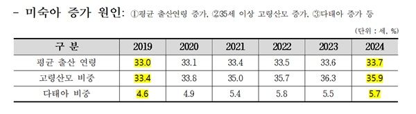 또 지난해 평균 출산연령은 2019년 대비 0.7살 늘었고 35세 이상 고령산모의 비중 역시 33.4%에서 35.9%로 2.5% 증가했다. 다태아 비중도 4.6%에서 5.7%로 1.2% 늘었다.