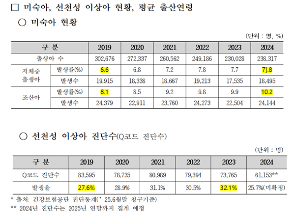 국회 보건복지위원회 소속 서미화 의원(더불어민주당)실이 보건복지부로부터 받은 ‘최근 6년간 미숙아 및 선천성 이상아 현황’에 따르면 선천성 이상아는 2019년 27.6%에서 2023년 32.1%로 4.5% 증가했다. 같은 기간 조산아비율은 8.1%에서 10.2%로 2.1%나 증가했으며 저체중 출생아 발생률은 2019년 6.6%에서 2024년 7.8%로 꾸준히 늘고 있는 것으로 확인됐다.