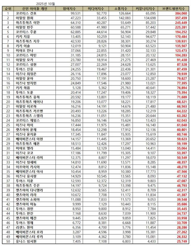 한국기업평판연구소는 신인 아이돌 개인 브랜드 2025년 10월 빅데이터 분석 결과를 지난 3일 공개했다. 연구소는 신인 아이돌 개인 브랜드평판 빅데이터 분석을 위해 지난달 3일부터 지난 3일까지 신인 아이돌그룹 브랜드 빅데이터 428만 2272개를 추출했다.