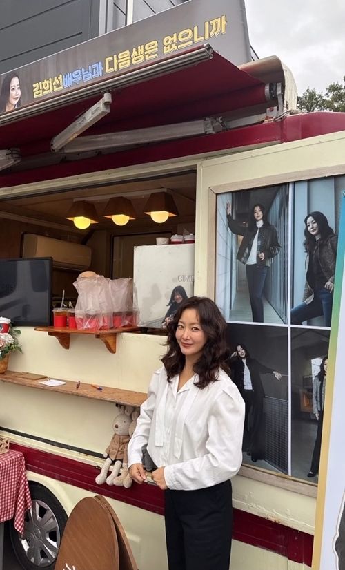 사진 속 김희선은 자신이 모델로 활동 중인 브랜드에서 보내 준 커피차 앞에서 환한 미소를 지으며 포즈를 취하고 있다. 커피차에는 “김희선 배우님과 다음 생은 없으니까, 모든 스태프 배우분들을 응원합니다!”라는 응원 문구가 걸려 있다.