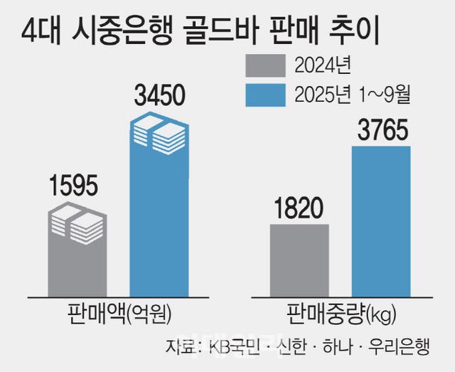 9일 금융권에 따르면 KB국민·신한·하나·우리은행 등 4대 시중은행의 올해(1~9월) 골드바 판매액은 3450억원으로 집계됐다. 지난해 같은 기간(1016억원)의 세 배가 넘는 수준이고 지난해 연간 판매액(1595억원)을 이미 두 배 이상 웃돌았다. 최근 2년간 누적 판매액은 5000억원을 돌파했다. 같은 기간 판매 중량은 3765㎏에 달했다. 특히 지난 9월 한 달간 판매액이 1037억원으로 집계돼 월 기준 역대 최대치를 기록했다.