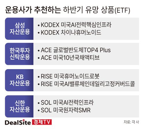 9일 운용업계에 따르면 주요 자산운용사들이 꼽은 하반기 유망상품은 AI 확산에 따른 신성장 산업과 안정적 현금흐름 확보에 초점이 맞춰졌다. 운용사들은 공통적으로 AI 확산과 구조적 변화에 따른 성장 섹터를 주목했으며, 한국투자신탁운용과 신한자산운용은 여기에 국채·원자력 등 방어 자산을 더해 균형 전략을 제시했다.