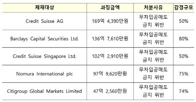과징금 부과 금액은 △Credit Suisse AG(169억원) △Barclays Capital Securities Ltd.(136억원) △Credit Suisse Singapore Ltd.(102억원) △노무라인터내셔널(97억원) △씨티그룹글로벌마켓(47억원) 순으로 컸다.