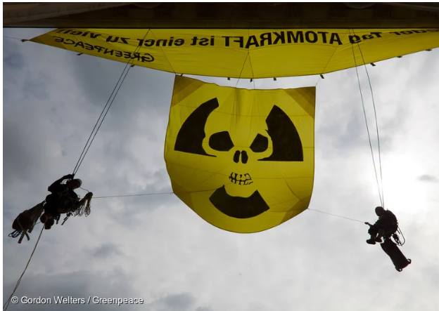 ▲ 그린피스 활동가들이 2011년 5월 독일 브란덴부르크 문에 대형 현수막을 설치하여 독일의 신속한 원자력 단계적 폐지와 에너지 정책의 전환을 촉구하는 메세지를 전했다. © Gordon Welters / Greenpeace