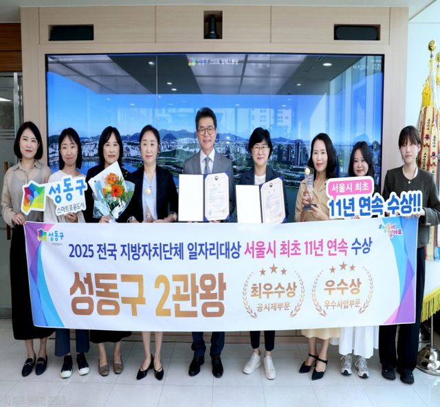 [파이낸셜경제=김영란 기자] 서울 성동구가 ‘2025년 전국 지방자치단체 일자리대상’에서 공시제 부문 ‘최우수상’과 우수사업 부문 ‘우수상’을 수상하며 2관왕 달성과 동시에 2015년부터 11년 연속 수상이라는 대기록을 세웠다고 밝혔다.