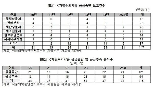 더불어 국가필수의약품의 공급중단, 공급부족 품목수도 같은 기간 215개에 달했다.