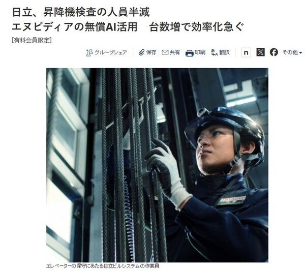 일본을 대표하는 엘리베이터 제조 기업 히타치가 AI를 도입해 엘리베이터 유지·보수 인력을 절반 수준으로 줄일 계획이다. AI가 작업 절차를 음성으로 안내하고, 작업 영상을 분석해 자동으로 보고서를 작성하는 방식이다. 미국 엔비디아의 오픈소스 AI 기술을 활용하며, 2026년 실용화를 목표로 하고 있다.