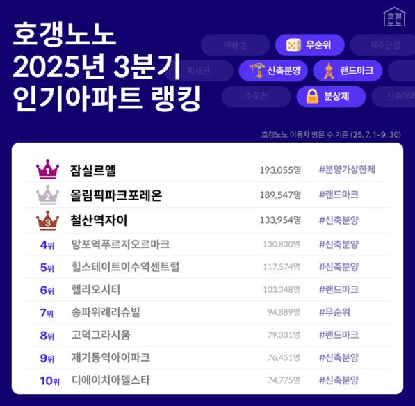 6위는 송파 ‘헬리오시티’, 7위는 ‘송파위례리슈빌’로, 각각 대단지 프리미엄과 무순위 청약 이슈로 꾸준한 관심을 받았다. 이어 △고덕그라시움(8위) △제기동역아이파크(9위) △디에이치아델스타(10위)가 뒤를 이었다.