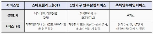 스마트안부확인서비스는 △가구전력 패턴 △통신 데이터(통화 수·발신, 문자, 모바일 데이터)를 확인하고, 서비스에 따라 △모바일폰 사용 △IoT센서(문열림 센서 등) △걸음걸이 수 등을 모니터링해 이상 신호 시 안부를 확인한다.