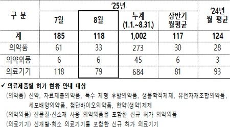 이번 8월 의료제품 허가 품목 수는 지난해 월평균 124개 대비 95% 수준으로 나타났다.