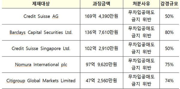 과징금 부과액은 크레딧스위스AG가 169억원으로 가장 높았고 뒤이어 ▲바클리 캐피탈(Barclays Capital Securities Limited) ㅜ136억원 ▲크레딧 스위스 싱가폴 102억원 ▲노무라인터내셔널 97억원 ▲씨티그룹글로벌마켓 47억원 순으로 컸다.