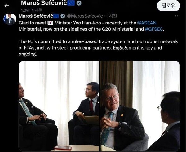 뉴시스 보도에 따르면, 셰프초비치 집행위원은 10일(현지 시간) 남아프리카공화국 그케베르하에서 열린 주요 20개국(G20) 장관회의 및 철강 공급과잉에 관한 글로벌포럼(GFSEC) 계기 회동 사실을 자신의 SNS ‘엑스(X)’를 통해 공개했다.
