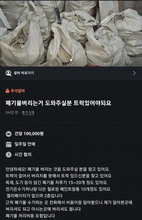 트럭 비용+ 폐기물 처리비용 만 해도 10만원 더 나올텐데
