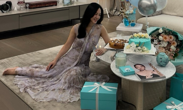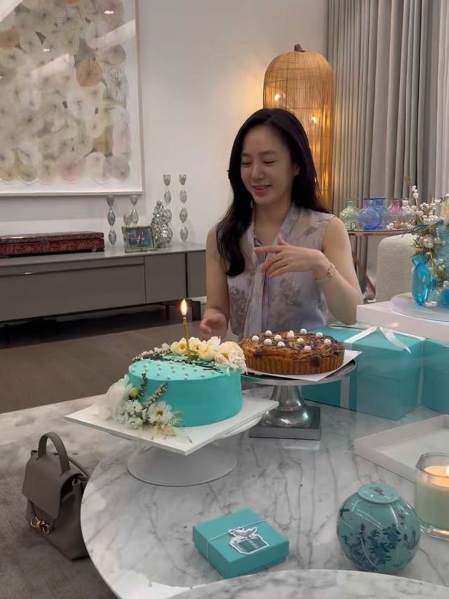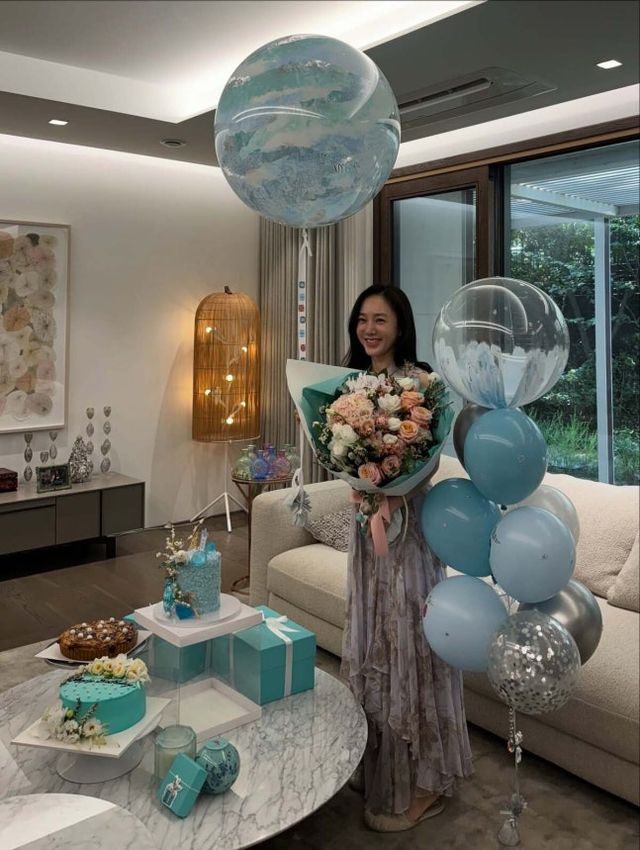 사진이 촬영된 공간 역시 시선을 사로잡았다. 티파니 블루 톤의 풍선, 생화 장식, 그리고 케이크가 놓인 곳은 마치 갤러리를 연상시키는 세련된 인테리어와 조명으로 꾸며져 있어 파티의 품격을 더했다