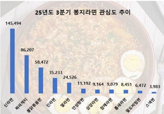 농심 신라면은 올해 3분기 14만 5494건이라는 압도적인 포스팅 수를 기록하며 봉지라면 브랜드 중 1위에 올랐다.