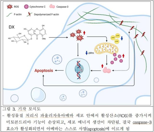 이번 실험에서 이 성분을 뽑아내 파울러자유아메바와 뇌세포를 함께 배양한 결과, 뇌세포에는 거의 영향을 주지 않으면서 아메바만 선택적으로 사멸시키는 효능이 확인됐다. 기존 치료제로 쓰이던 ‘암포테리신B’가 독성이 강해 환자에게 큰 부담을 준다는 점을 생각하면, 안전성이 높은 새로운 후보 물질을 찾았다는 데 의미가 크다.