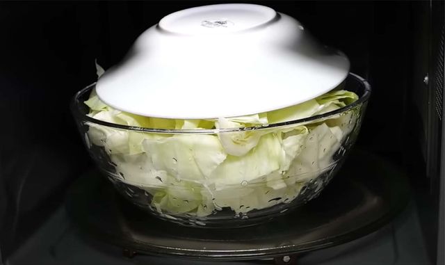 내열 용기에 양배추를 담은 후 사기 접시로 뚜껑을 덮고 전자레인지에 7분간 돌리면 된다. 김 셰프는 "랩으로 씌워서 하면 안 좋다고 하니까 사기 접시로 꼭 해야 한다"고 당부했다. 그는 "절대 물을 넣고 찌는 게 아니다. 그대로 쪄야 한다. 그래야 아삭아삭하다"며 조리 시 주의사항을 전했다.