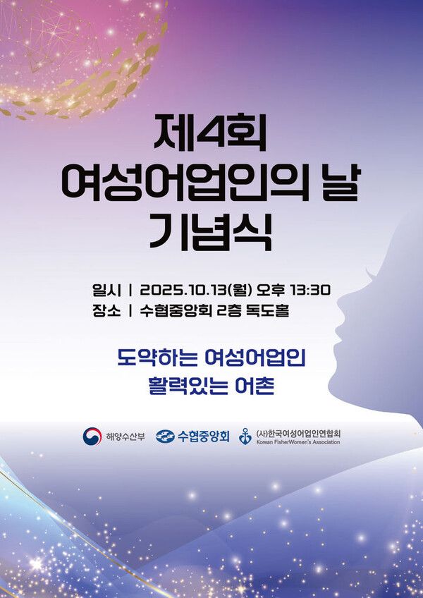 이번 기념식에는 김성범 해양수산부 차관을 비롯해 김호 농어업·농어촌특별위원회 위원장, 노동진 수협중앙회 회장, 김향숙 한국여성어업인연합회 회장 등 150여 명이 참석한다.