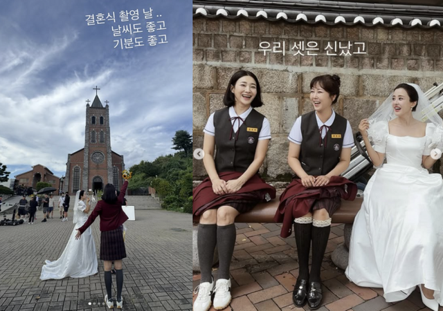 이는 박은혜가 출연하는 KBS1 새 일일드라마 ‘마리와 별난 아빠들’ 촬영 현장인 것으로 드러났다. 함께 출연하는 배우 박현정과 조향기는 교복 차림으로 웨딩드레스를 입은 박은혜 옆에서 미소 짓고 있다.
