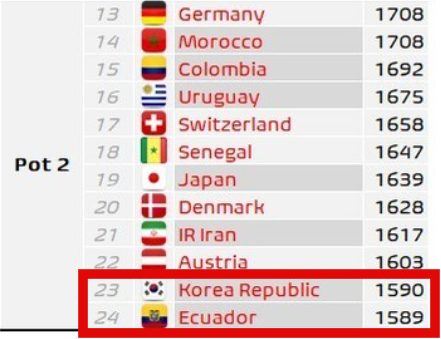 '풋볼 미츠 데이터'도 포트1 끝자락에 위치한 크로아티아(1709점)가 포트2 최상단의 독일과 모로코(이상 1708점)에 자리를 내줄 수 있으며, 포트2에서는 한국이 에콰도르와 호주에 역전당할 수도 있는 상황이라는 점을 짚었다.