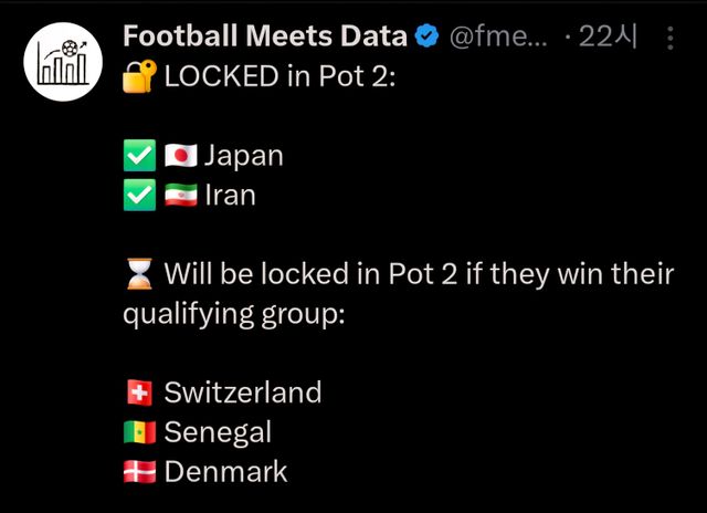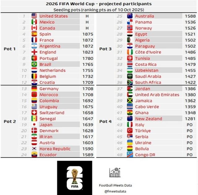 축구 콘텐츠 제작소 '풋볼 미츠 데이터'는 11일(한국시간) 10월 A매치 주간에 열린 첫 번째 A매치 결과를 반영한 2026 FIFA 북중미 월드컵 포트 배정 표를 공개했다.