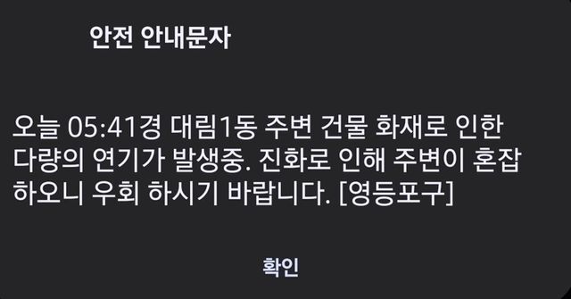 불이 나면서 주변으로 연기가 퍼지자 영등포구청은 “화재로 인한 다량의 연기가 발생 중. 진화로 인해 주변이 혼잡하니 우회하시기 바란다”라는 내용의 안전 안내 문자를 발송했다.