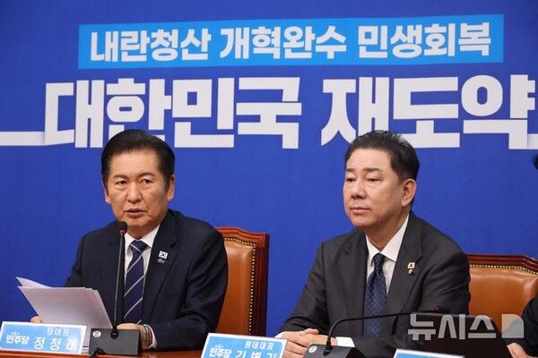 정 대표는 "민주당은 내란 잔재 청산, 개혁, 그리고 민생경제라는 기조 아래 국회의원들이 그간 준비한 역량을 충분히 발휘해 국민을 편안하게 하는 출발점이 되는 국감이 되기를 기원한다"고 말했다.