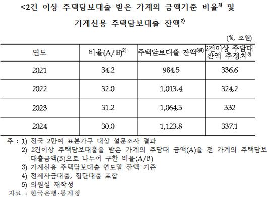 2건 이상 주담대를 받은 가계의 주담대 잔액은 2021년 말 336조6000억원에서 2022년 말 324조2000억원으로 줄었다가 2023년 말 332조원, 2024년 말 337조1000억원 등으로 다시 늘었다.