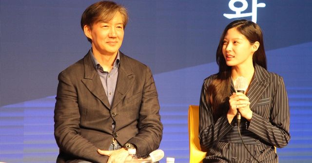 2023년 4월 11일 조국 전 법무부장관이 부산 해운대구 쿠무다 콘서트홀에서 열린 '조국의 법고전 산책' 북콘서트 저자와의 대화에서 딸 조민씨와 대화를 나누고 있다. / 뉴스1