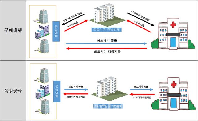 이러다 보니 일부 의료기기 도매상은 의료기기 중간 유통단계에서 특정 의료기관에 납품을 전담하는 간납업체의 형태를 보인다. 보통 의료기관이 사실상 지배·경영하며 역할·소유주체에 따라 구매대행, 독점공급, 페이퍼컴퍼니 등 다양한 유형으로 부정적인 영업형태를 갖추고 있다는 것이 김 의원의 설명이다.